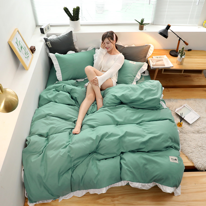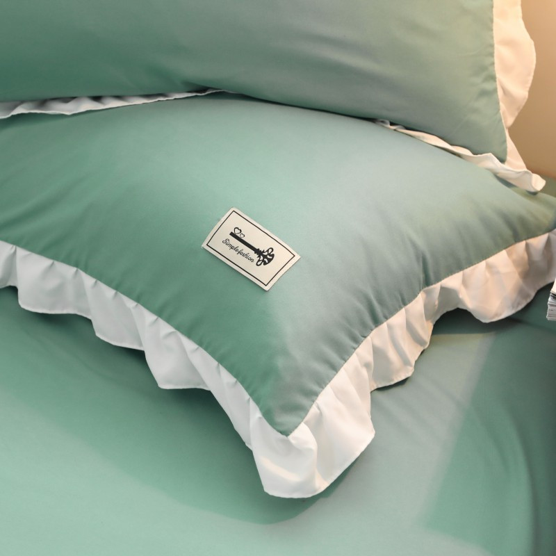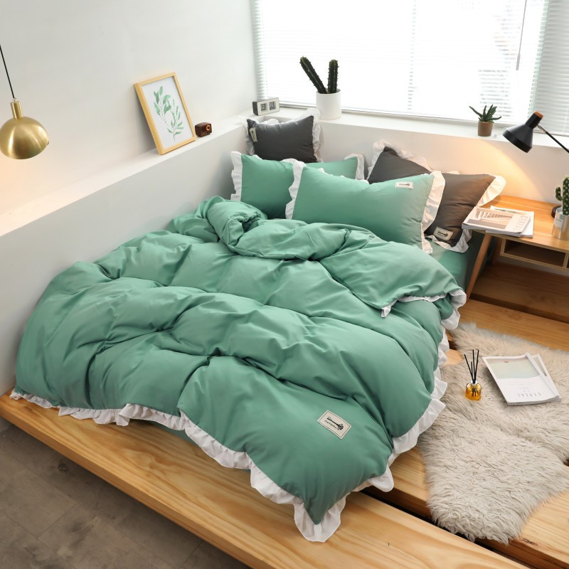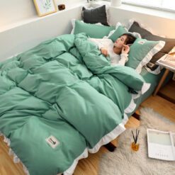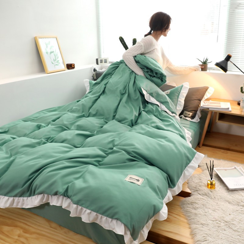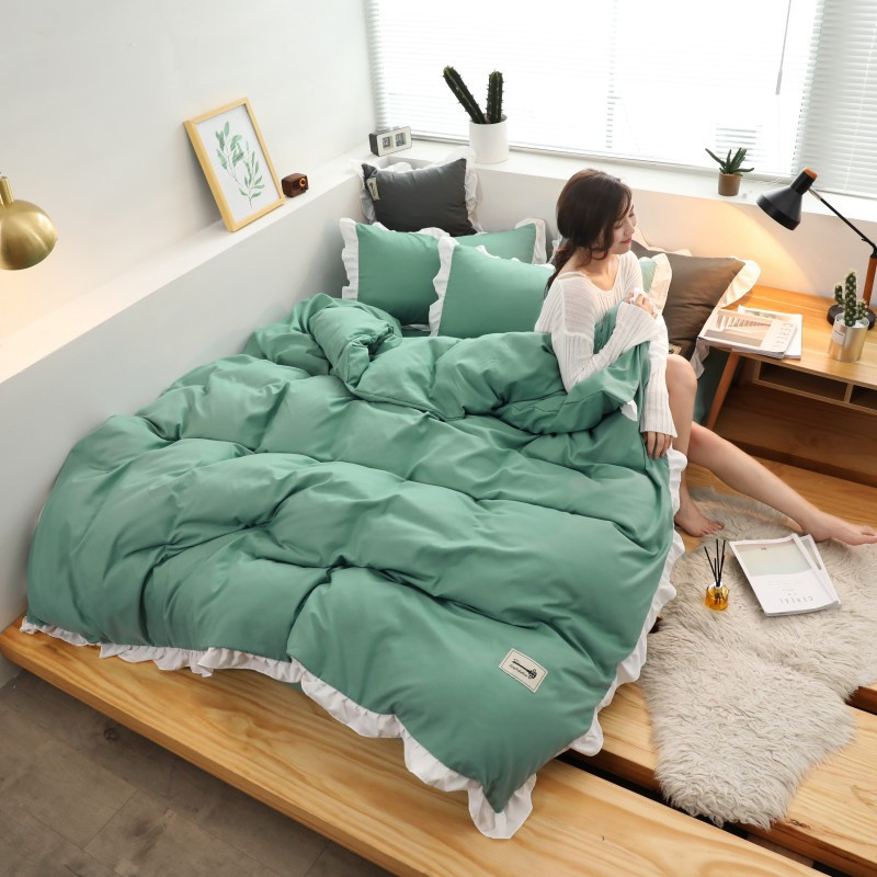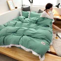 Điểm nhấn của sản phẩm là ở vỏ chăn và vỏ gối có lớp bèo trắng dày dặn viền xung quanh sản phẩm nhìn tổng thể thì rất sang trọng.